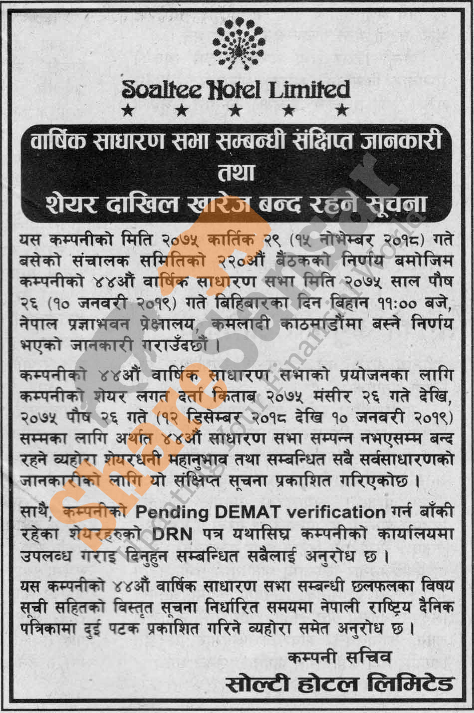 Soaltee Hotel Limited has published a book closure date for its 44th AGM on (26th Mangsir, 2075).