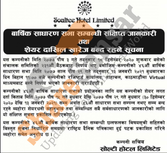 Soaltee Hotel Limited has published notice regarding Book Closure date and its 46th AGM which is going to be held on 29th Poush, 2077.