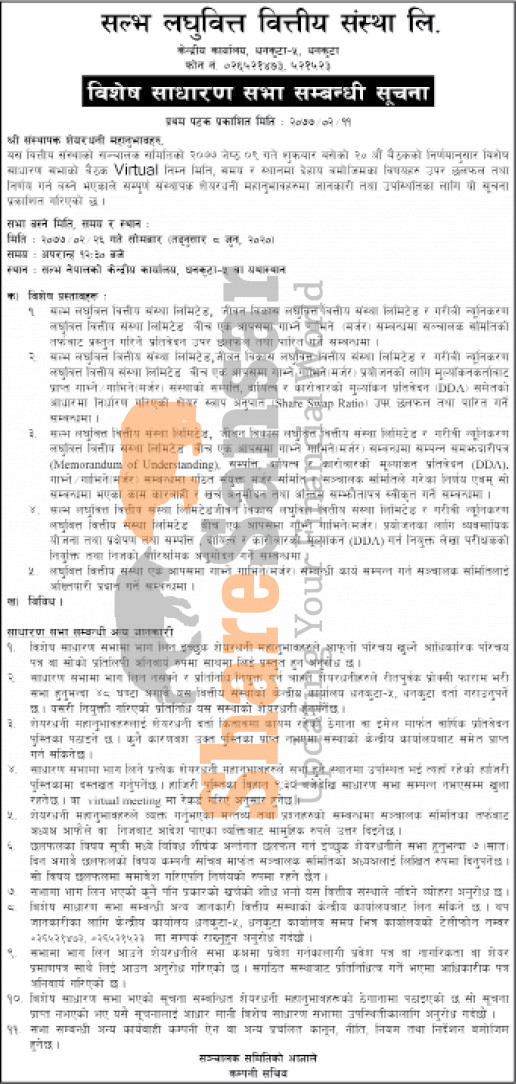 Solve Laghubitta Bittiya Sanstha Limited has announced it's Special General Meeting going to be held on 26th Jestha, 2077.