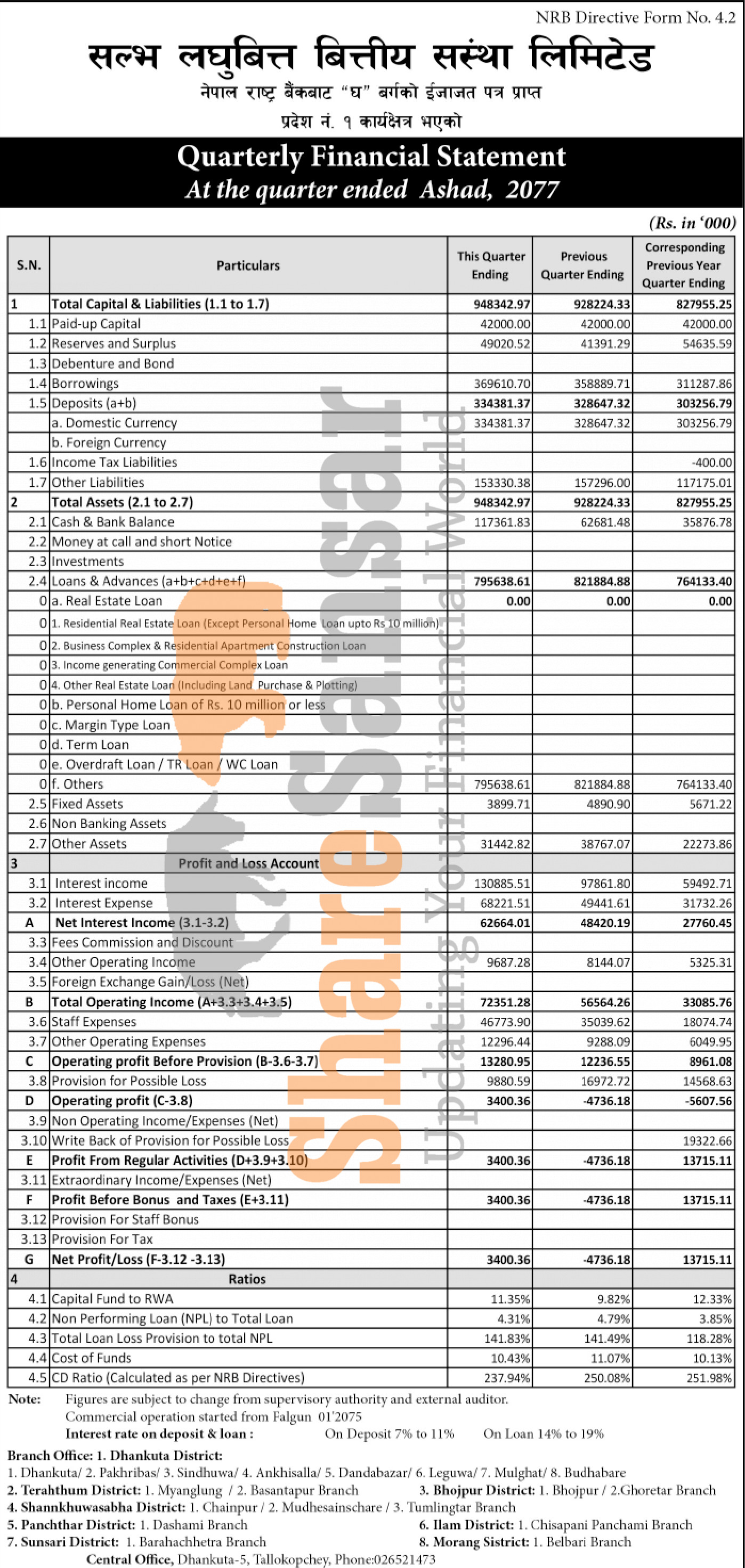 Solve Laghubitta Bittiya Sanstha Limited has posted a net profit of Rs 3.4 million during the 4th quarter of the fiscal year 2076/77.
