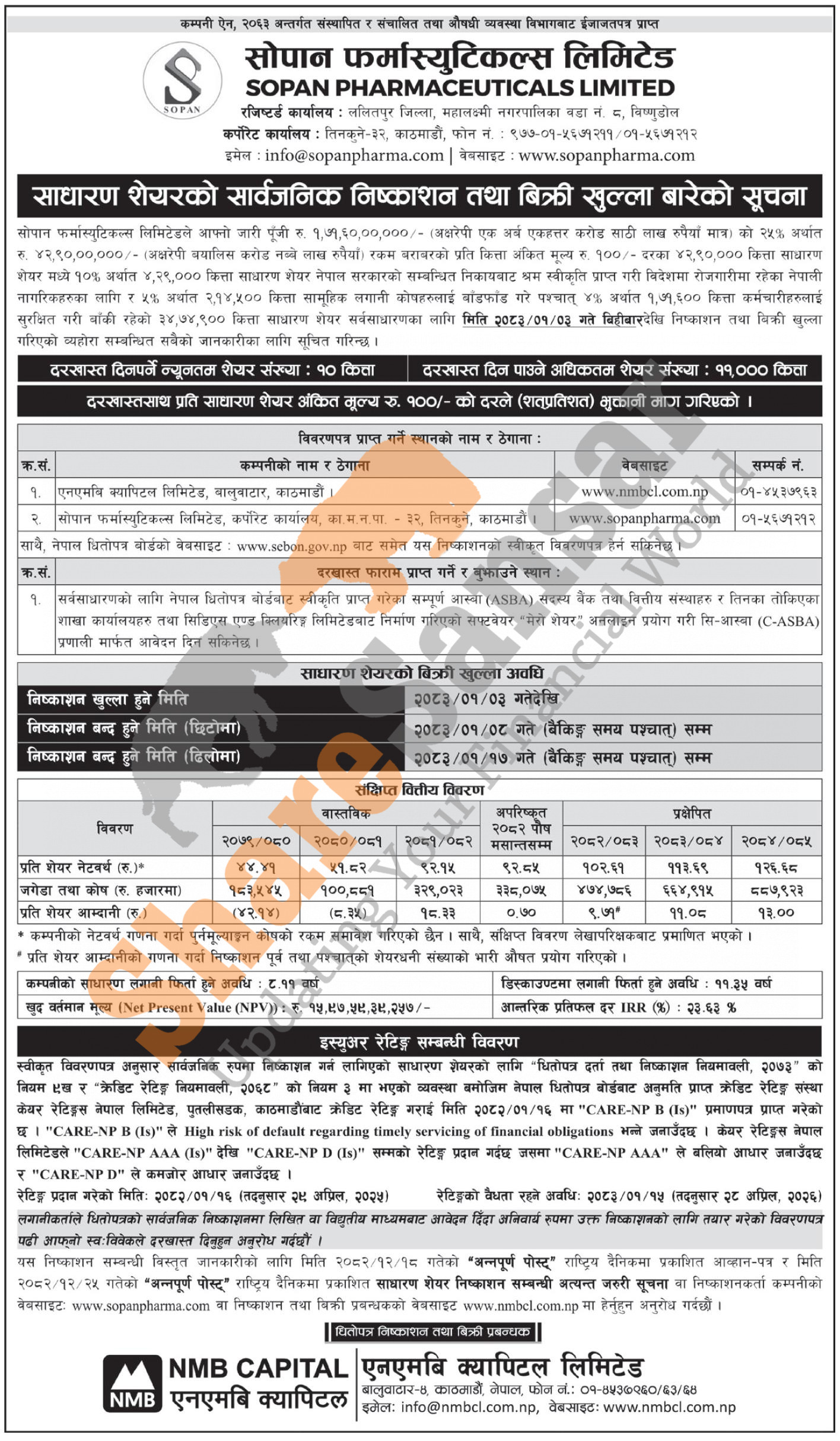 Sopan Pharmaceuticals Limited is opening its 34,74,900 units IPO shares to the general public from today (3rd Baisakh, 2083).