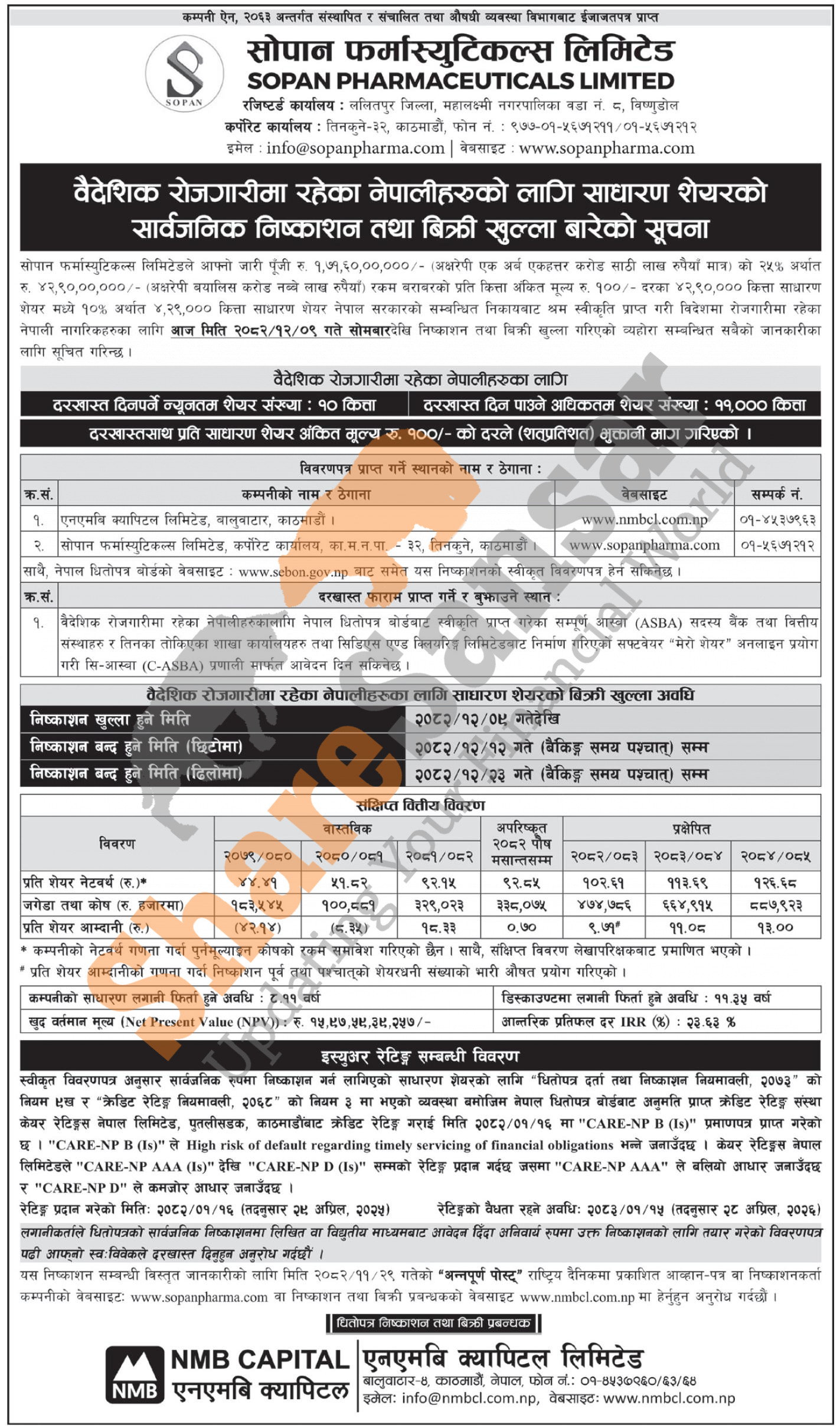 Sopan Pharmaceuticals Limited is opening its 4,29,000 units IPO Shares to Foreign Nepalese Employees from today (9th Chaitra, 2082).