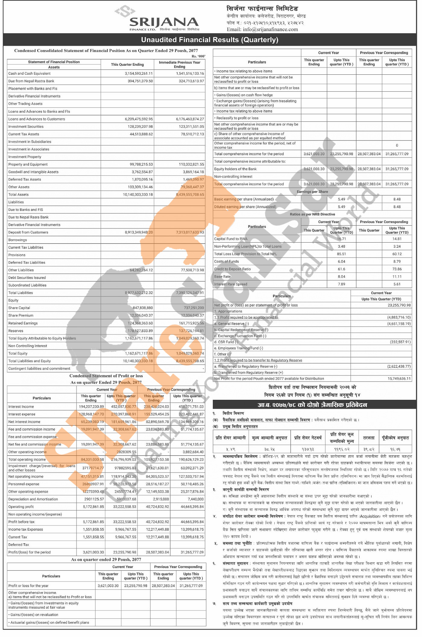 Srijana Finance Limited has posted a net profit of Rs 23.25 million and published its 2nd quarter company analysis of the fiscal year 2077/78.