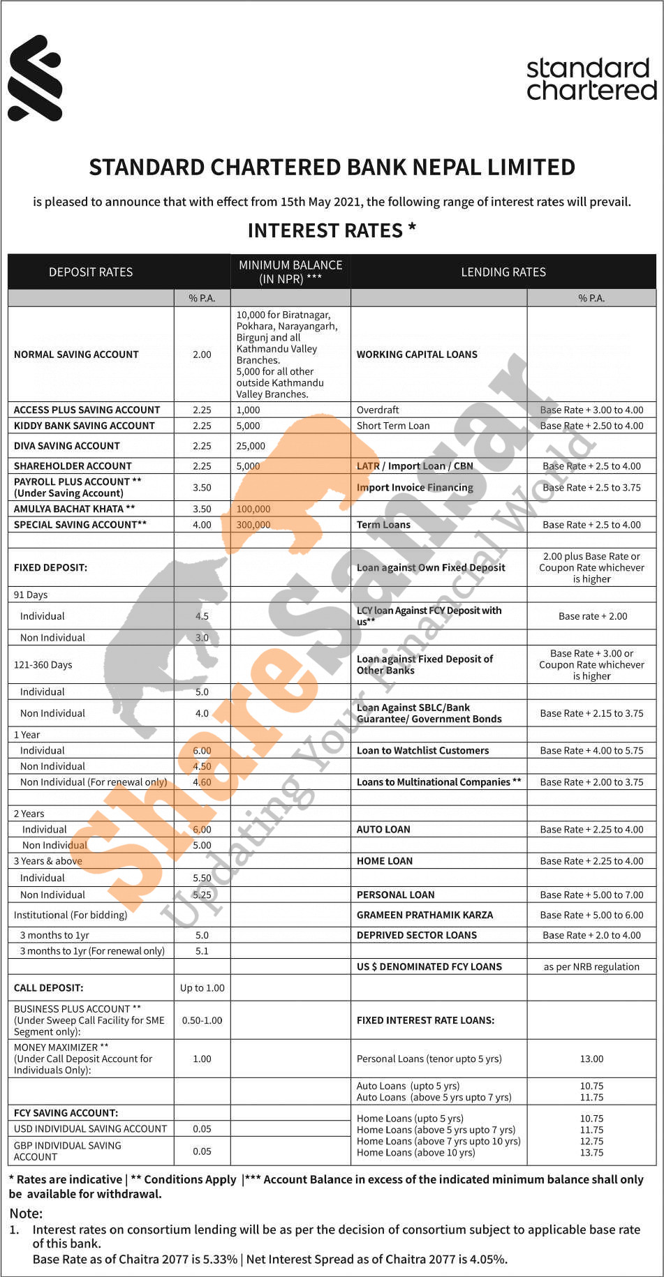 Standard Chartered Bank Limited has published a notice regarding the new interest rate for deposit and loan products and it's effective from 1st Jestha, 2078.