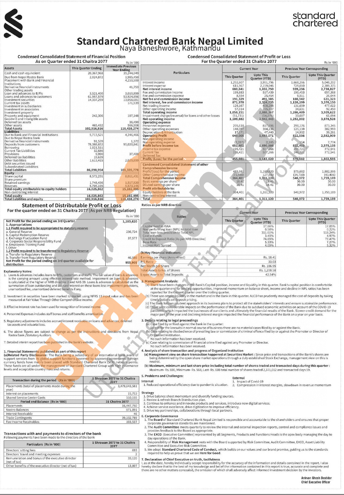 Standard Chartered Bank Nepal Limited has posted a net profit of Rs 1.18 billion and published its 3rd quarter company analysis of the fiscal year 2077/78.
