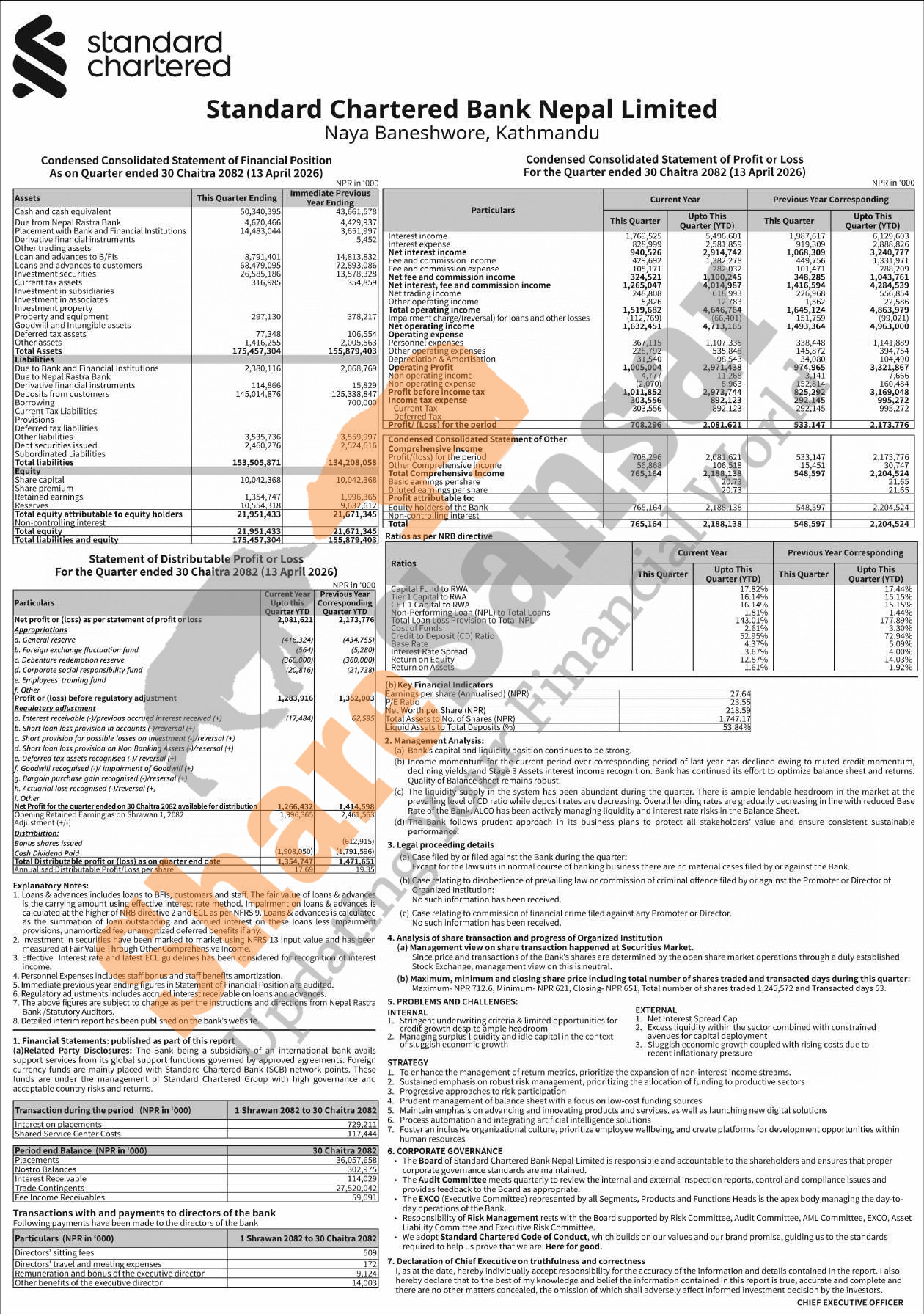 Standard Chartered Bank Nepal Limited has posted a net profit of Rs 2.08 billion and published its 3rd quarter company analysis of the fiscal year 2082/83.
