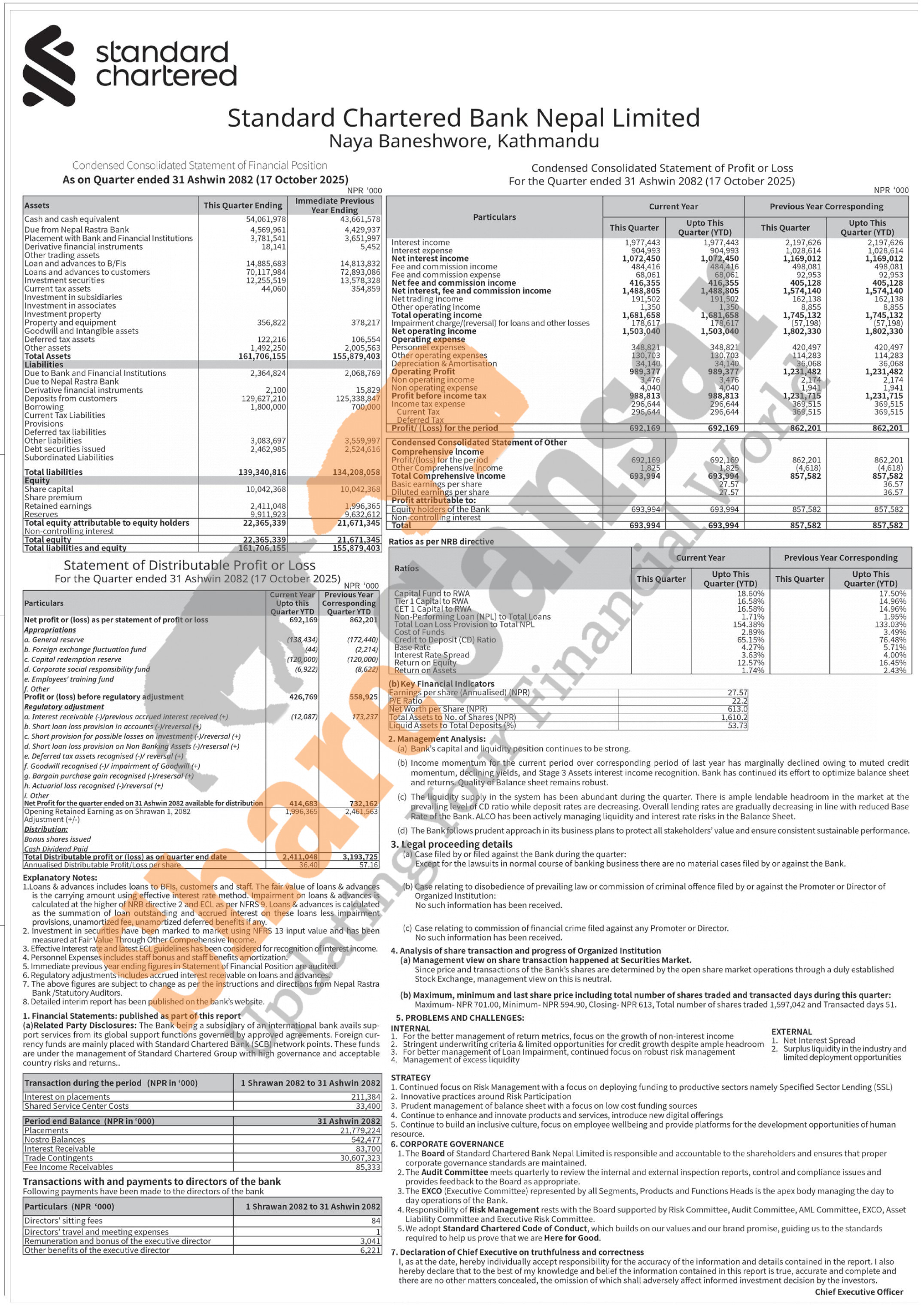 Standard Chartered Bank Nepal Limited has posted a net profit of Rs 692.16 million and published its 1st quarter company analysis of the fiscal year 2082/83.