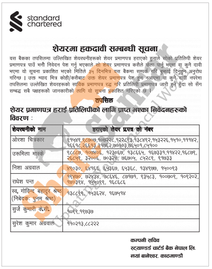 Standard Chartered Bank Nepal Limited has published a notice regarding a claim for lost share certificates.