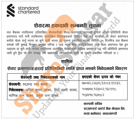 Standard Chartered Bank Nepal Limited has published a notice regarding a claim for lost share certificates.