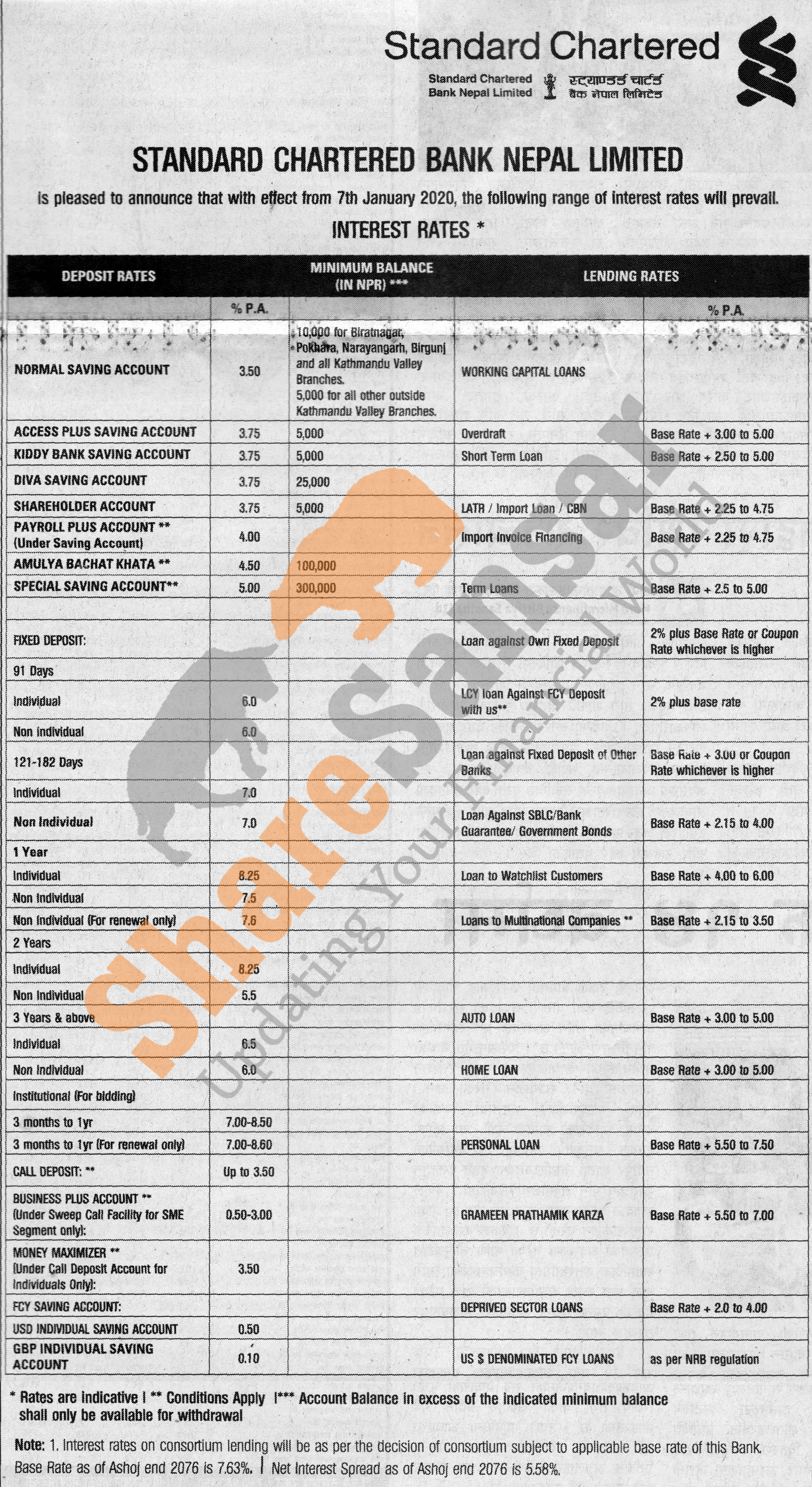 Standard Chartered Bank Nepal Limited has published a notice regarding new interest rate and its effective from 22nd Poush, 2076.