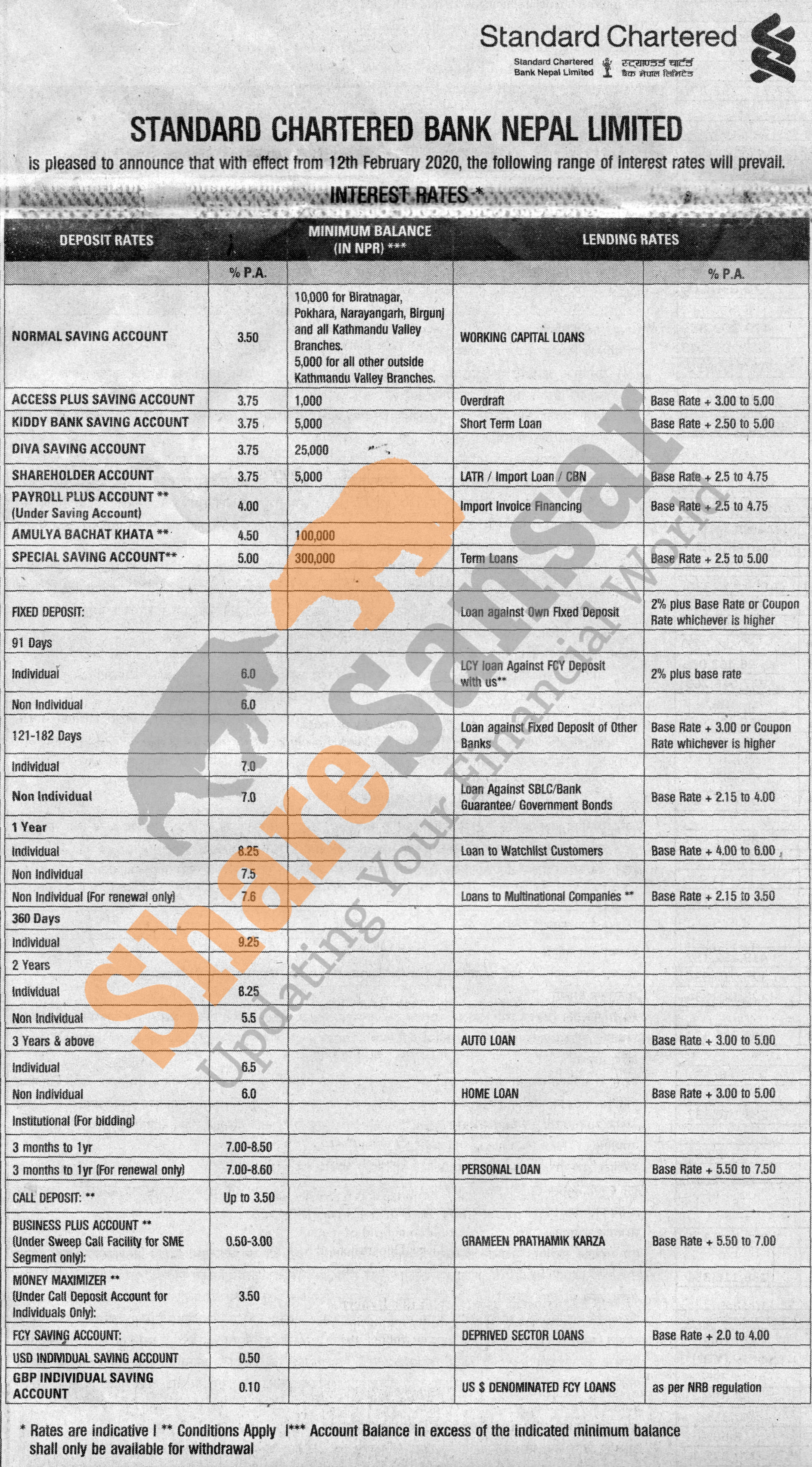 Standard Chartered Bank Nepal Limited has published a notice regarding new interest rate and its effective from 29th Magh, 2076.