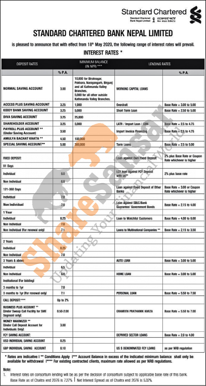 Standard Chartered Bank Nepal Limited has published a notice regarding new interest rate and its effective from 5th Jestha, 2077.
