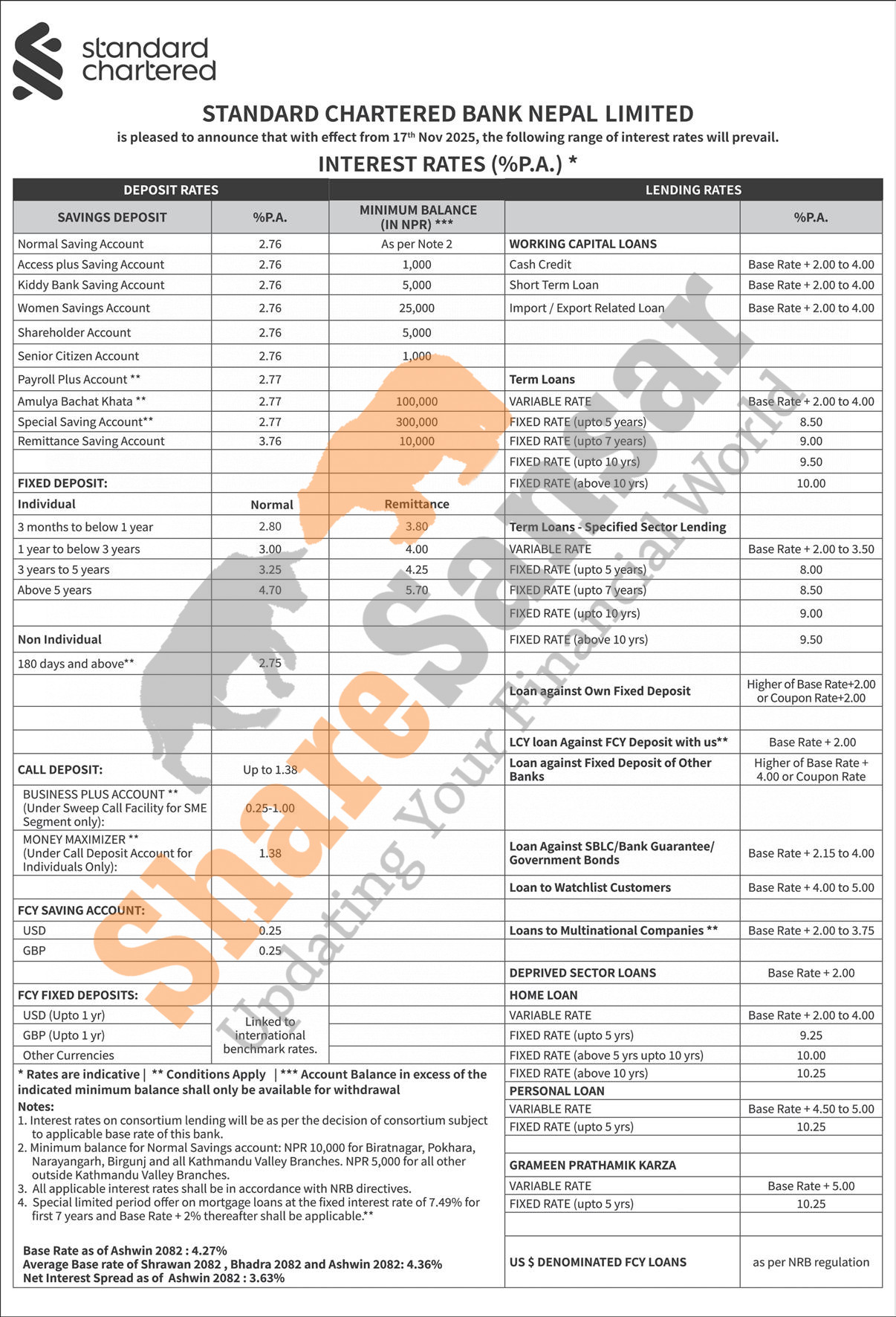 Standard Chartered Bank Nepal Limited has published a notice regarding the new interest rate for deposit and loan products and it's effective from 1st Mangsir, 2082.