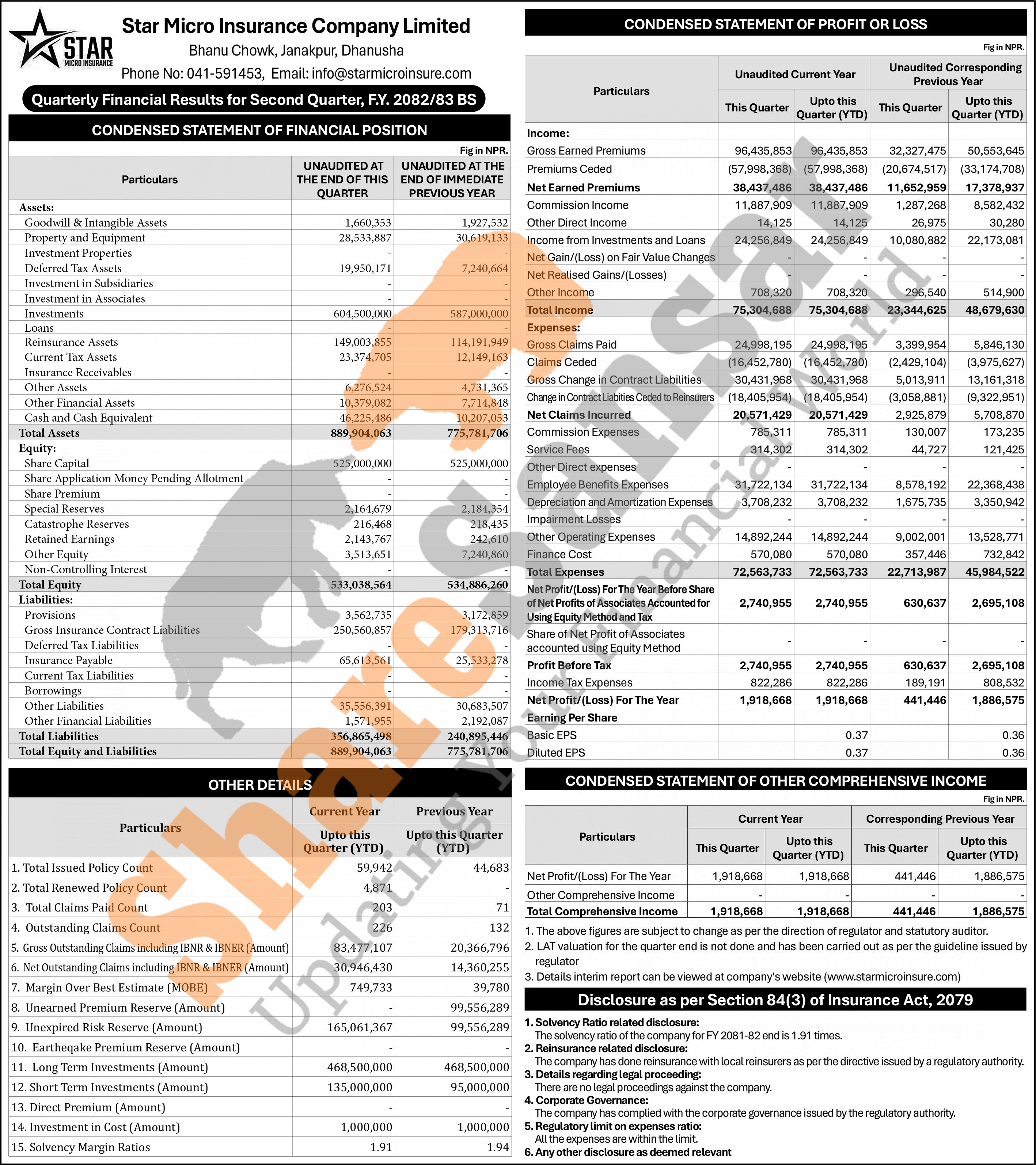 Star Micro Insurance Company Limited has posted a net profit of Rs 1.91 million and published its 2nd quarter company analysis of the fiscal year 2082/83.