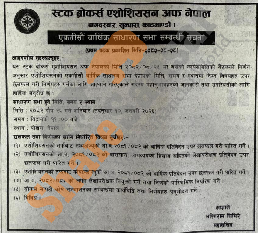 Stock Brokers Association of Nepal has announced its 31st AGM going to be held on 26th Poush, 2082.