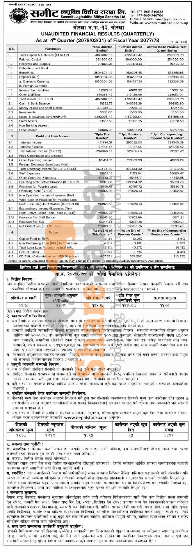 Summit Laghubitta Bittiya Sanstha Limited has posted a net profit of Rs 119.80 million and published its 4th quarter company analysis of the fiscal year 2077/78.