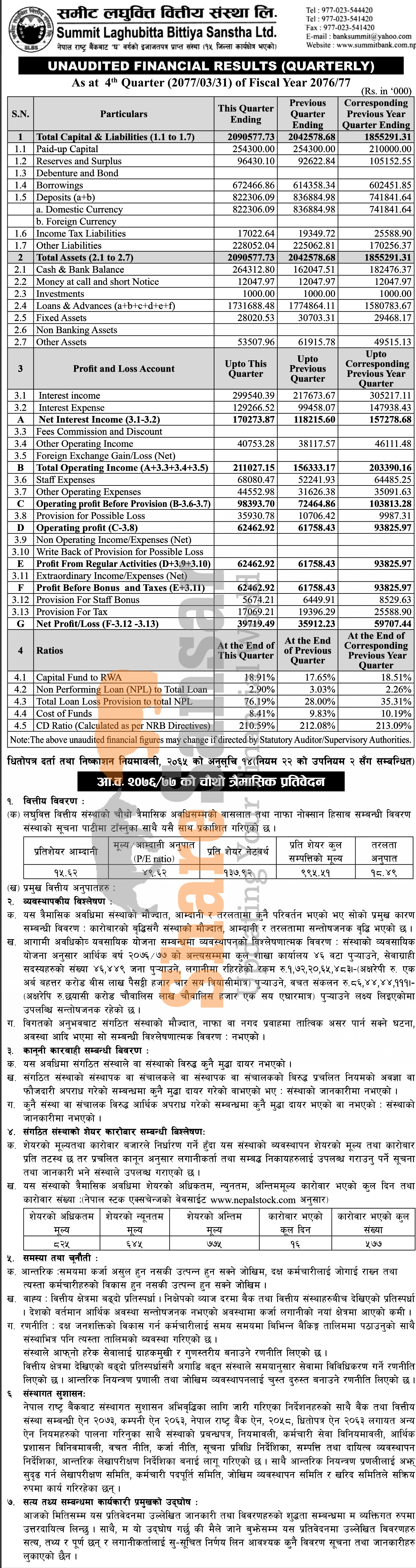Summit Laghubitta Bittiya Sanstha Limited has posted a net profit of Rs 39.71 million and published its 4th quarter company analysis of the fiscal year 2076/77.