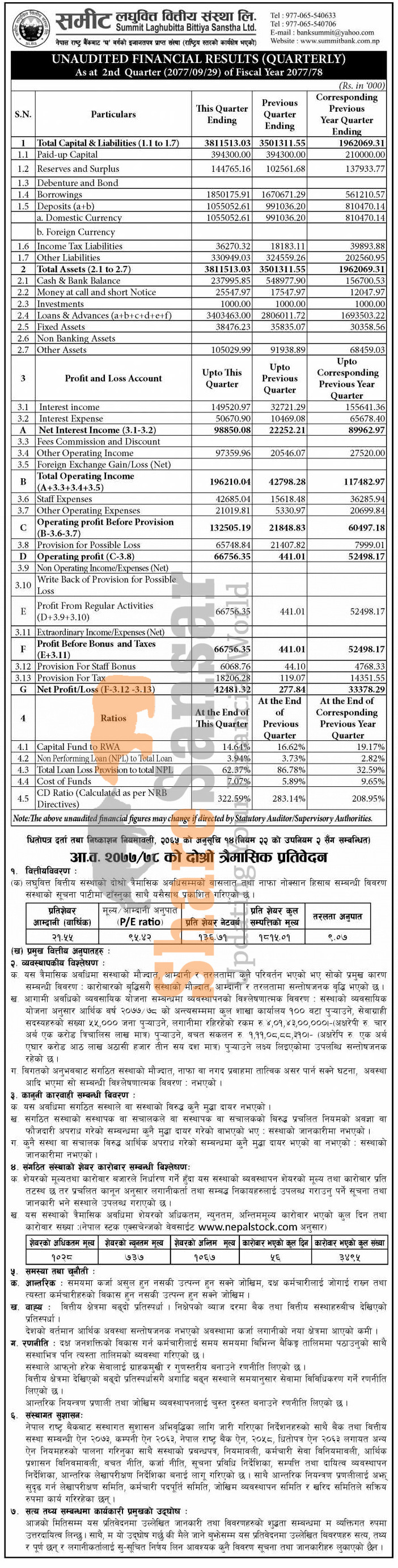 Summit Laghubitta Bittiya Sanstha Limited has posted a net profit of Rs 42.48 million and published its 2nd quarter company analysis of the fiscal year 2077/78.