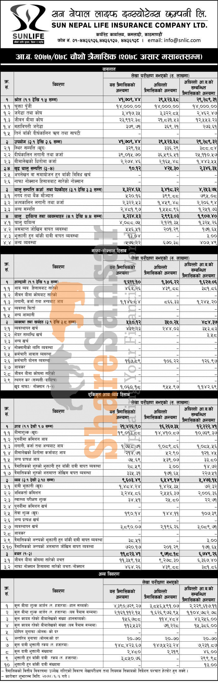 Sun Nepal Life Insurance Company Limited has posted a net profit of Rs 1.060 million and published its 4th quarter company analysis of the fiscal year 2077/78.