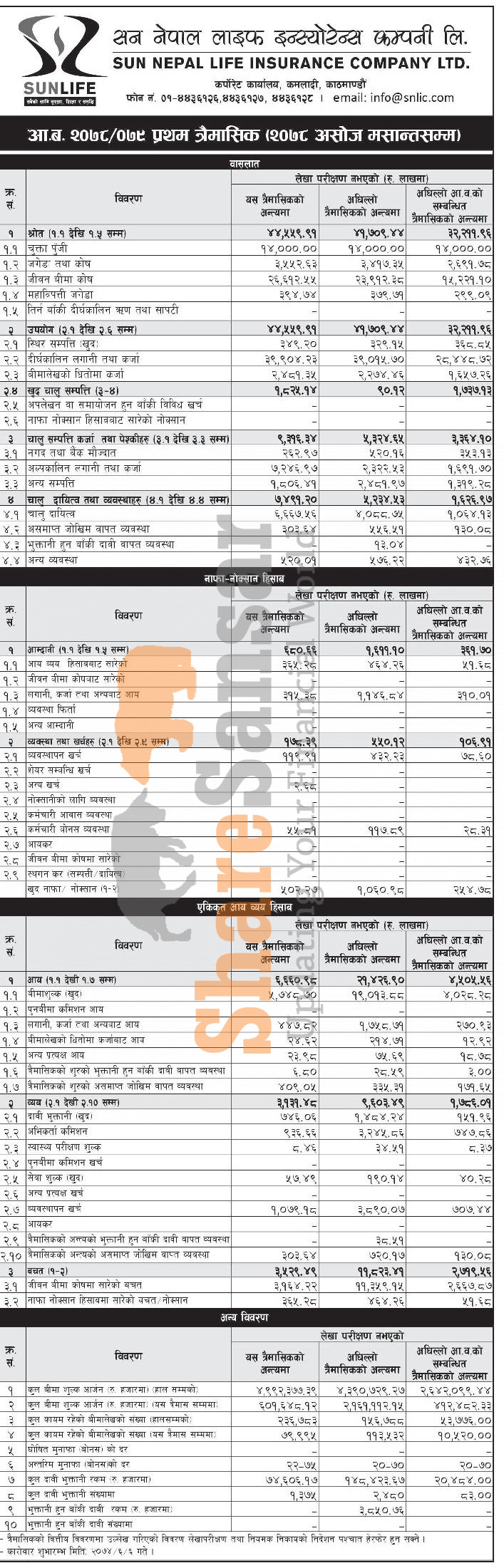 Sun Nepal Life Insurance Company Limited has posted a net profit of Rs 50.22 million during the 1st quarter of the fiscal year 2078/79.