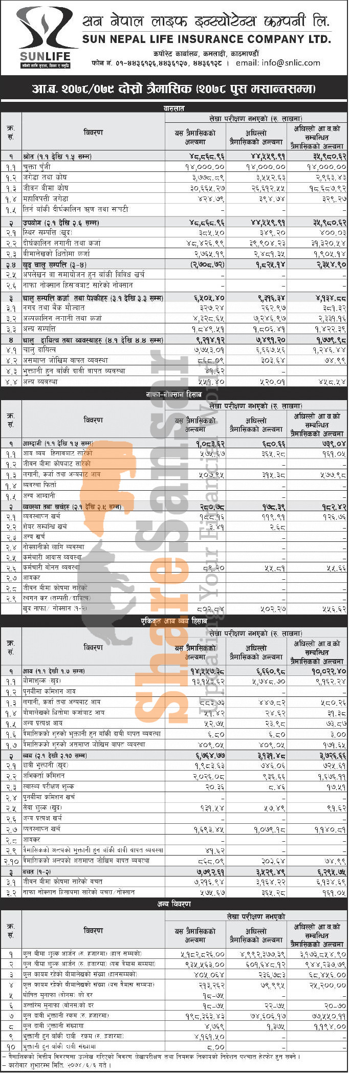 Sun Nepal Life Insurance Company Limited has posted a net profit of Rs 80.28 million during the 2nd quarter of the fiscal year 2078/79.
