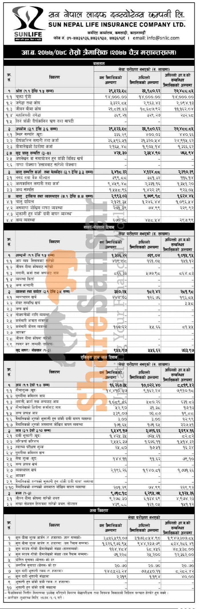 Sun Nepal Life Insurance Company Limited has posted a net profit of Rs 95.59 million and published its 3rd quarter company analysis of the fiscal year 2077/78.