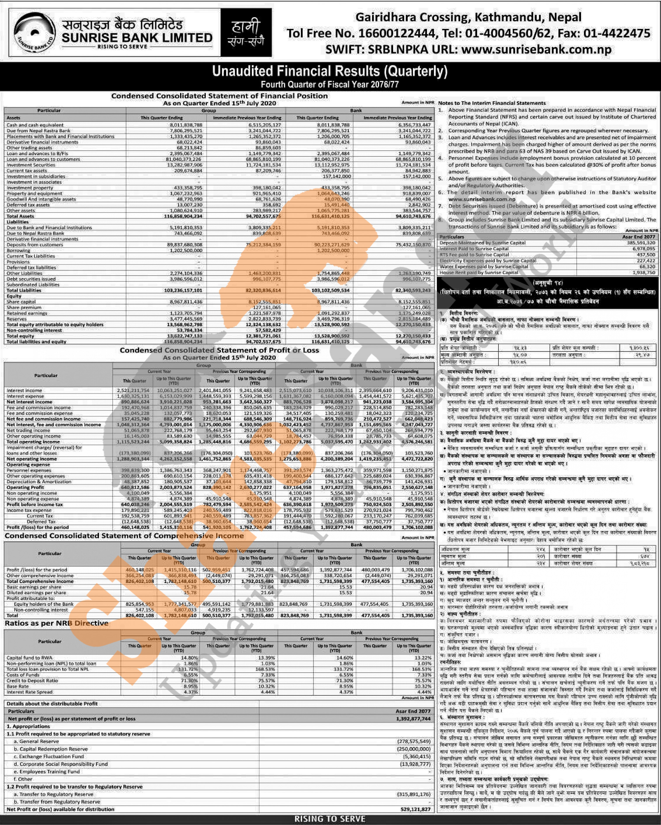 Sunrise Bank Limited has posted a net profit of Rs 1.39 billion and published its 4th quarter company analysis of the fiscal year 2076/77.
