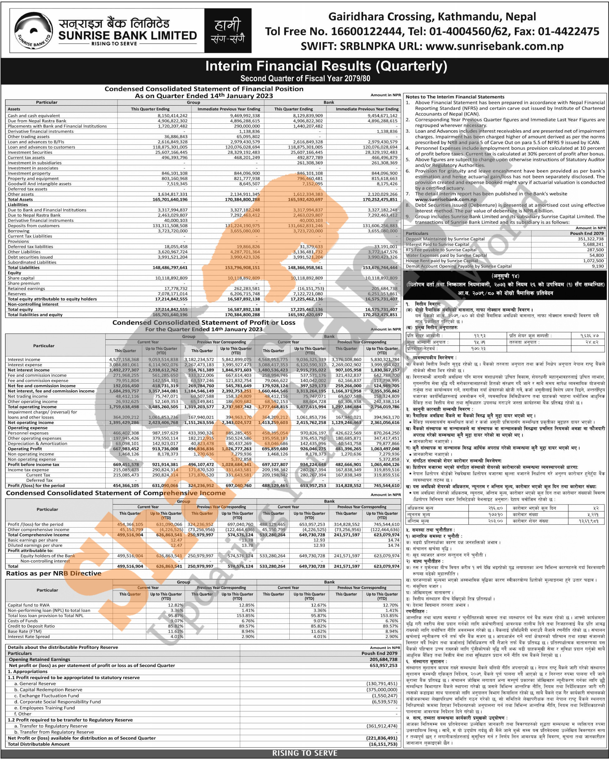 Sunrise Bank Limited has posted a net profit of Rs 653.95 million and published its 2nd quarter company analysis of the fiscal year 2079/80.