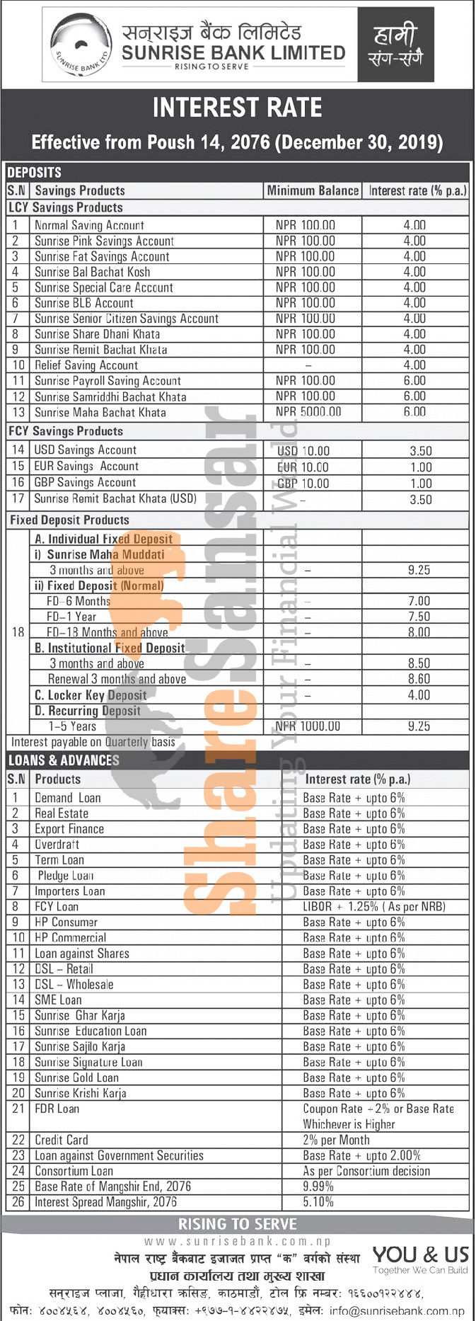 Sunrise Bank Limited has published a notice regarding new interest rate and its effective from 14th Poush, 2076.
