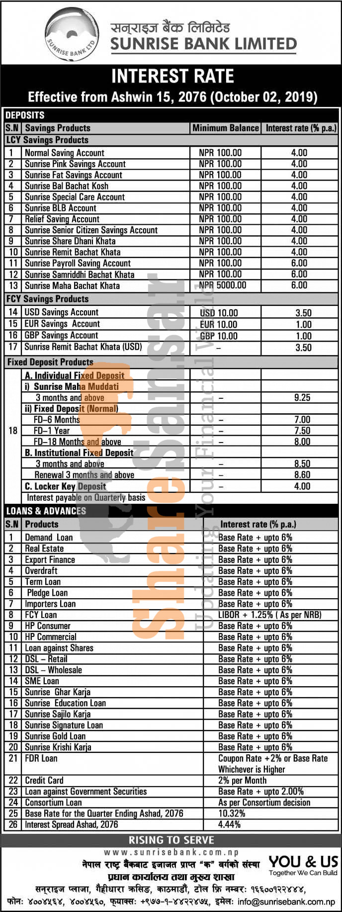 Sunrise Bank Limited has published a notice regarding new interest rate and its effective from 15th Ashwin, 2076.
