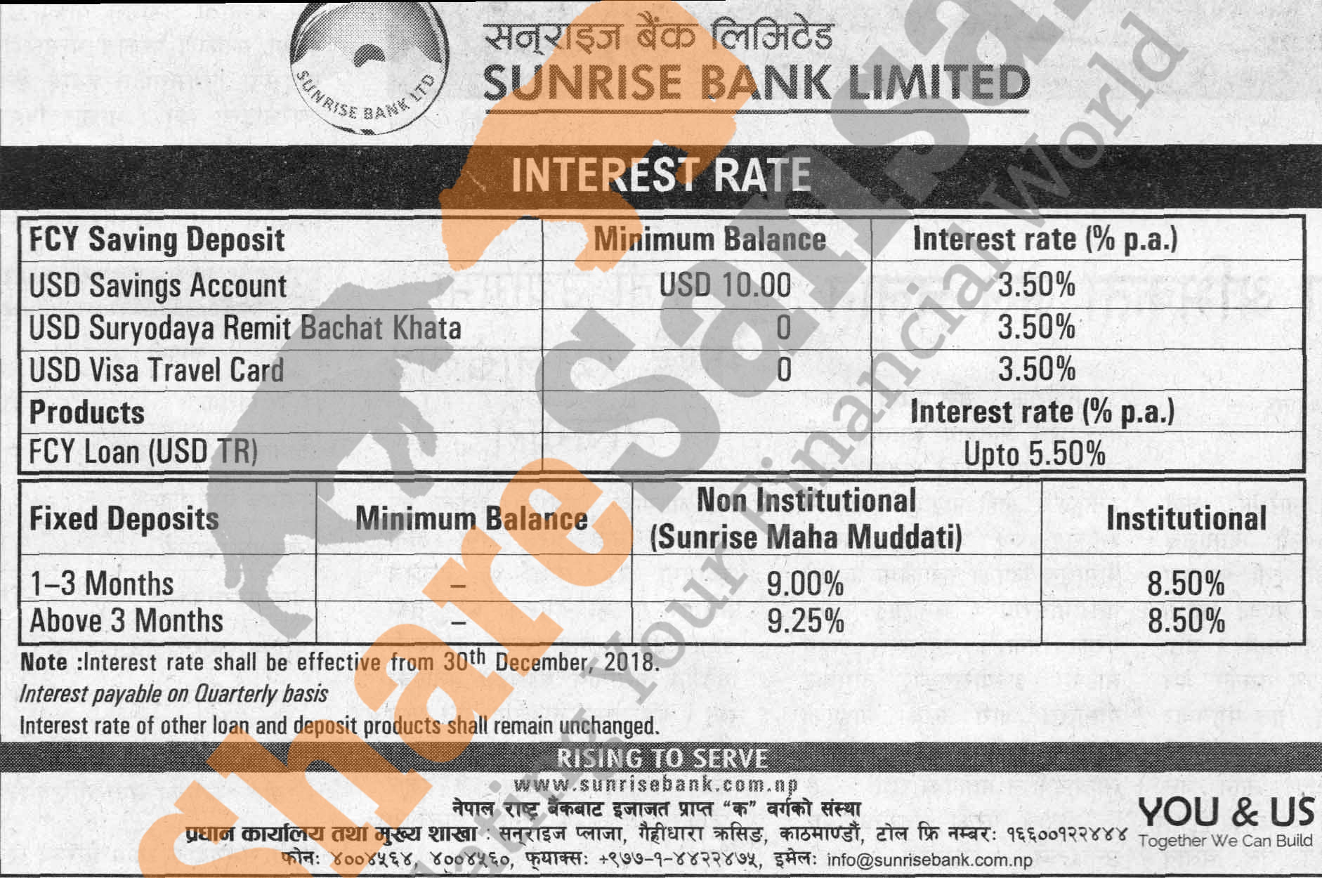 Sunrise Bank Limited has published a notice regarding new interest rate and its effective from 15th Poush, 2075.