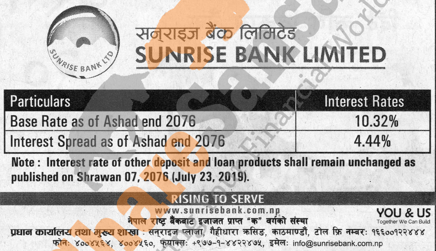 Sunrise Bank Limited has published a notice regarding new interest rate and its effective from 15th Shrawan, 2076.