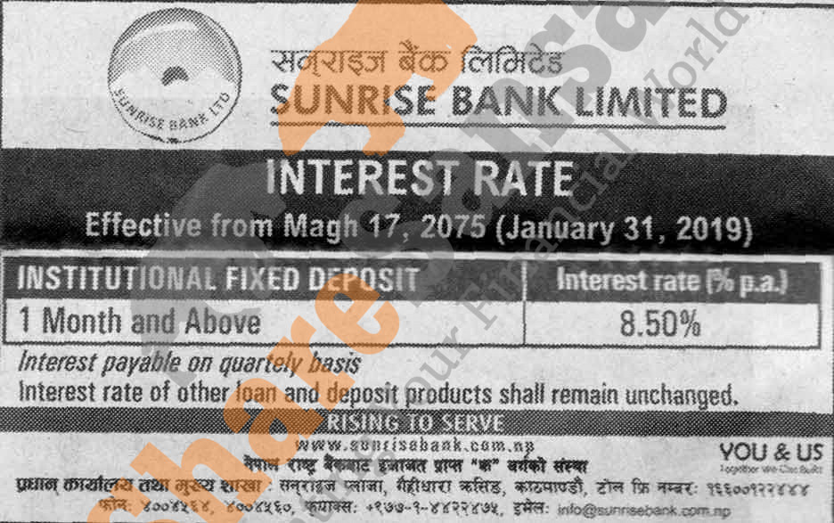 Sunrise Bank Limited has published a notice regarding new interest rate and its effective from 17th Magh, 2075.