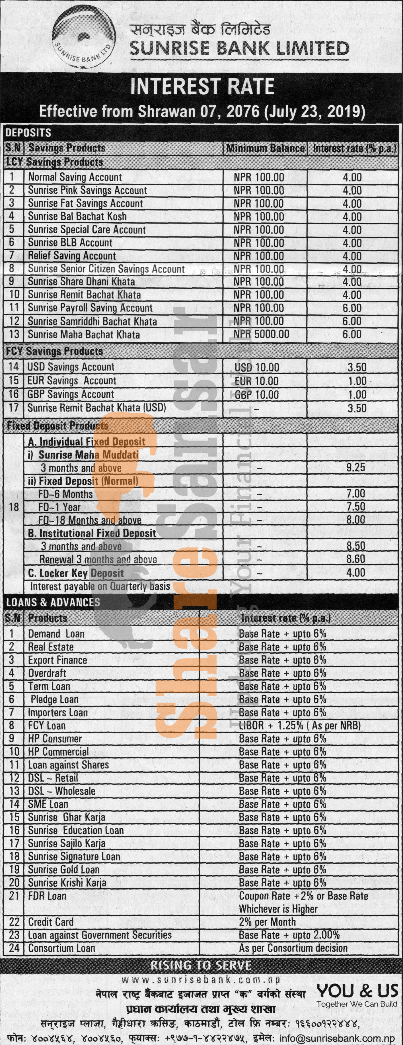 Sunrise Bank Limited has published a notice regarding new interest rate and its effective from 7th Shrawan, 2076.
