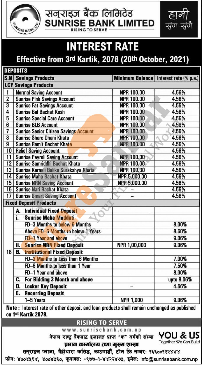 Sunrise Bank Limited has published a notice regarding new revised interest rate and it's effective from 3rd Kartik, 2078.