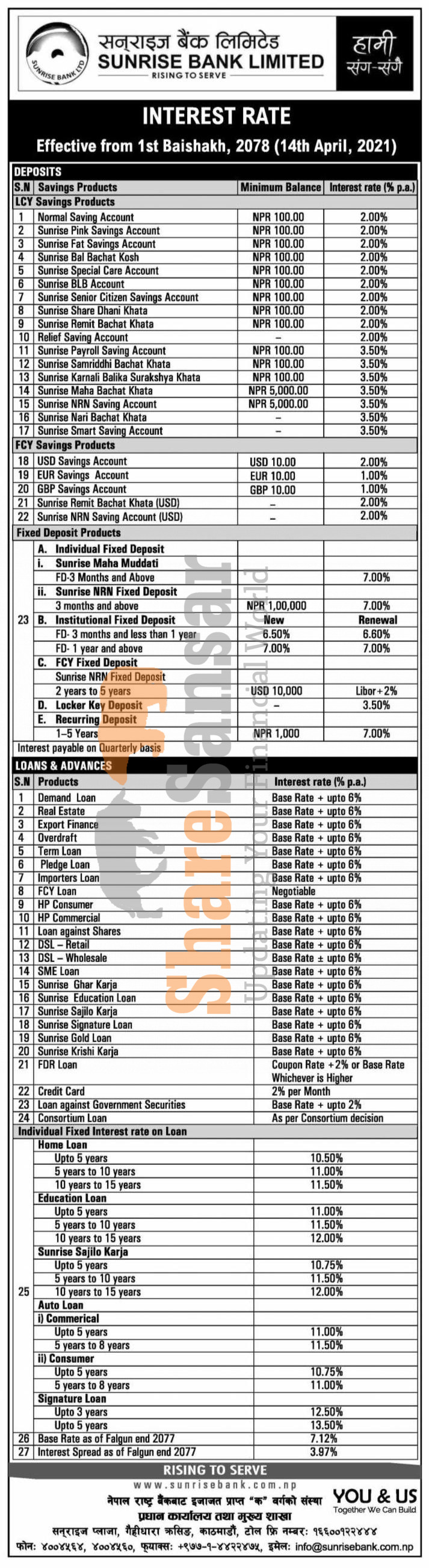 Sunrise Bank Limited has published a notice regarding the new interest rate for deposit and loan products and it's effective from 1st Baisakh, 2078.