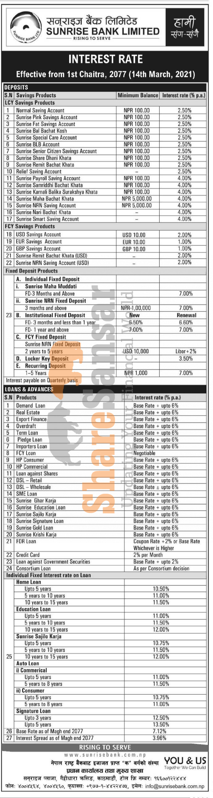 Sunrise Bank Limited has published a notice regarding the new interest rate for deposit and loan products and it's effective from 1st Chaitra, 2077.