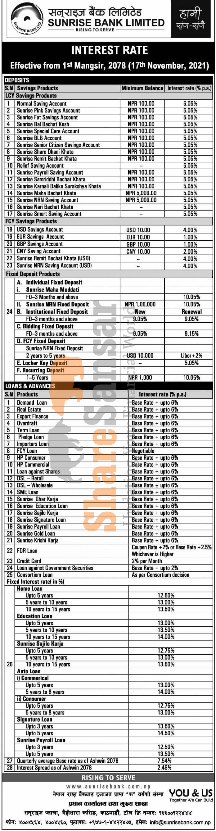 Sunrise Bank Limited has published a notice regarding the new interest rate for deposit and loan products and it's effective from 1st Mangsir, 2078.