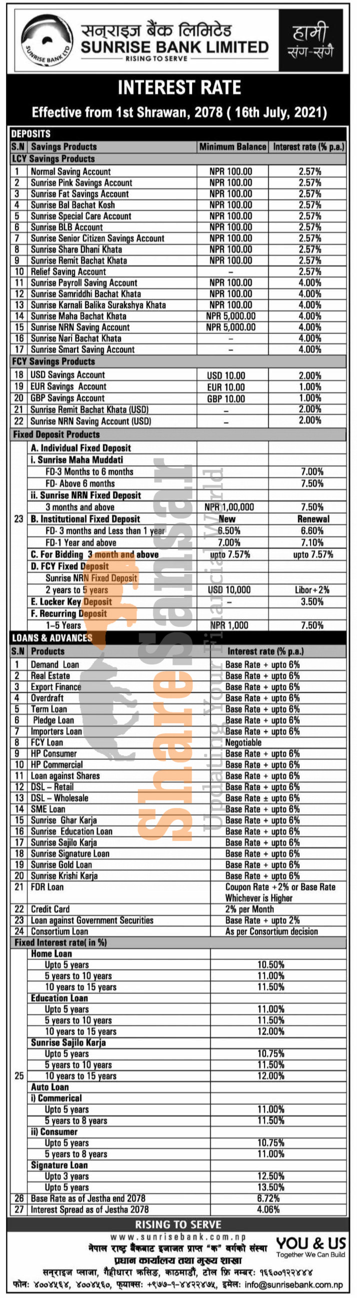 Sunrise Bank Limited has published a notice regarding the new interest rate for deposit and loan products and it's effective from 1st Shrawan, 2078.