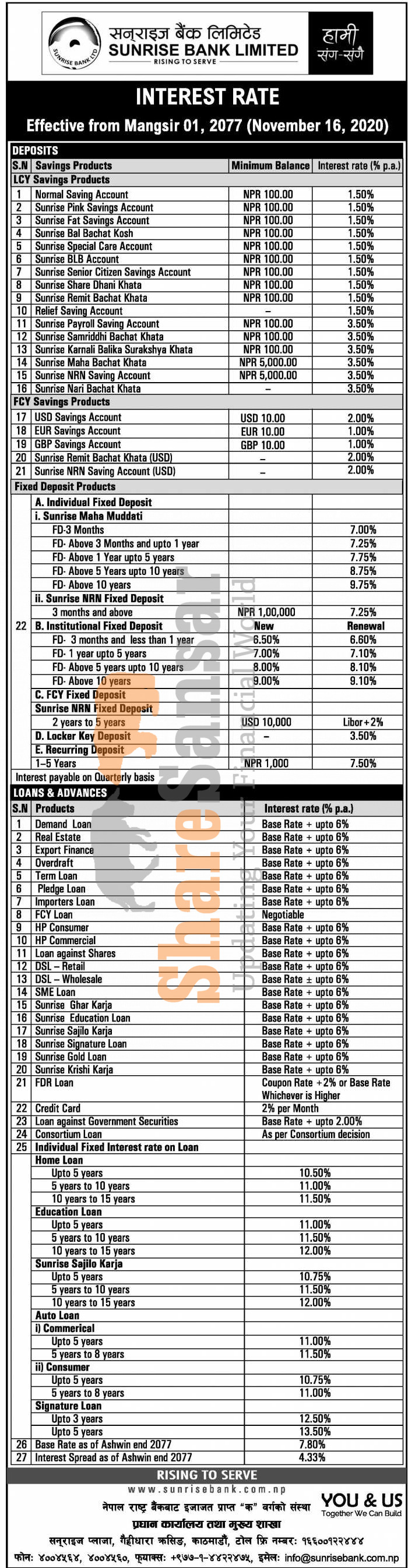 Sunrise Bank Limited has published a notice regarding the new interest rate for its deposit and loan products and it's effective from 1st Mangsir, 2077.