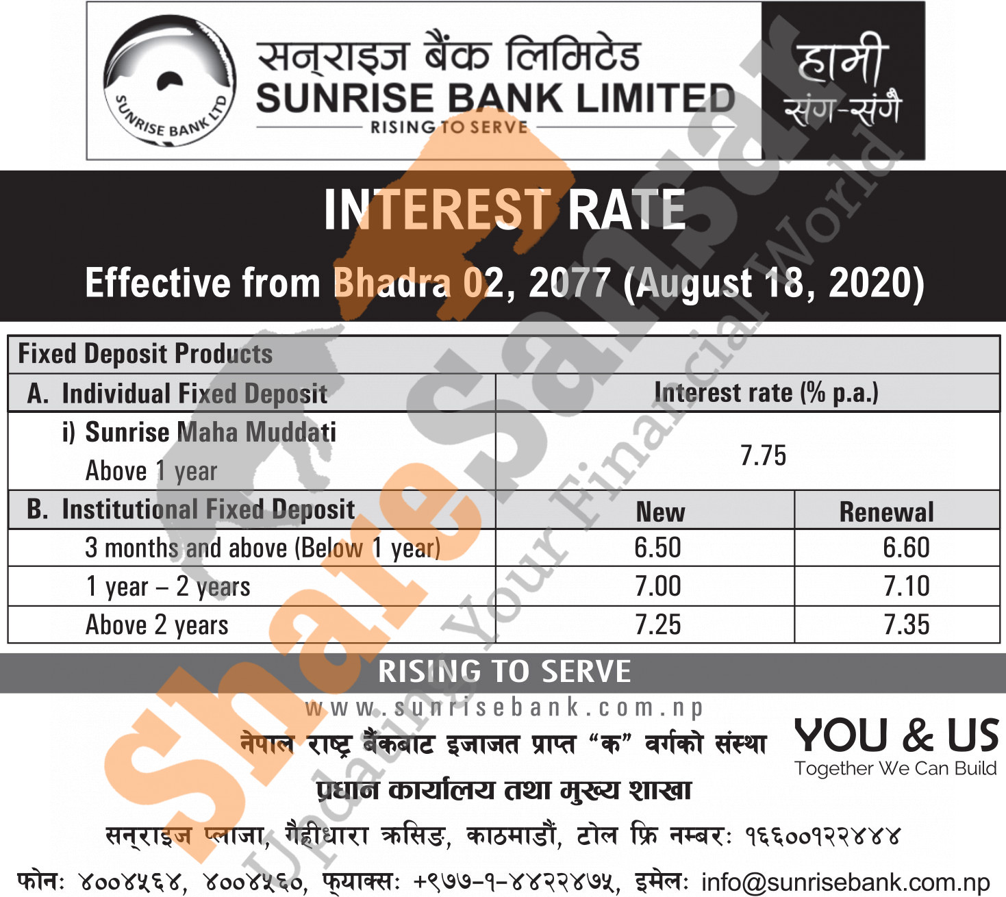 Sunrise Bank Limited has published a notice regarding the new interest rate for its deposit products and its effective from 2nd Bhadra, 2077.