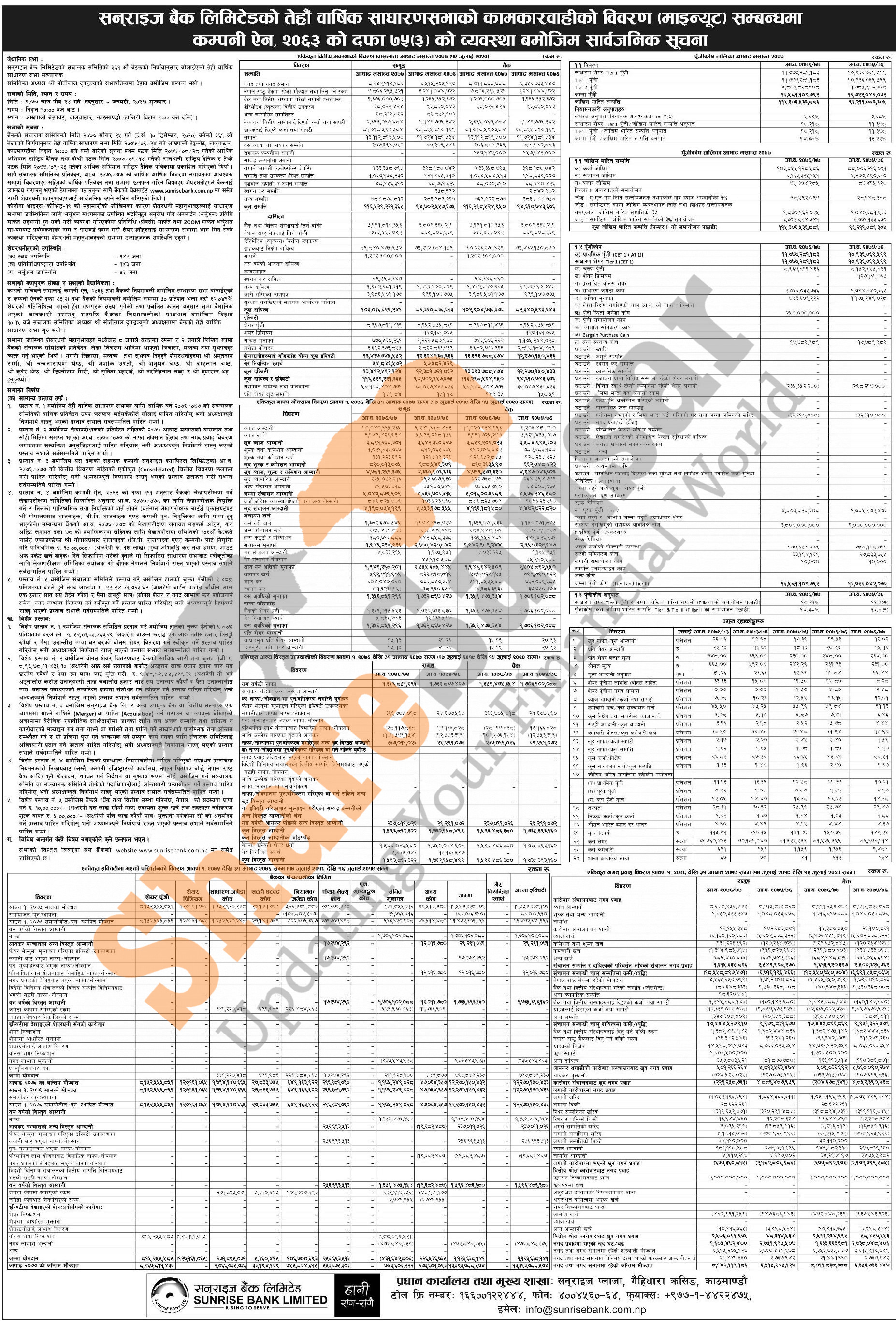 Sunrise Bank Limited has published its 13th AGM minute and published financial highlights of fiscal year 2076/77.