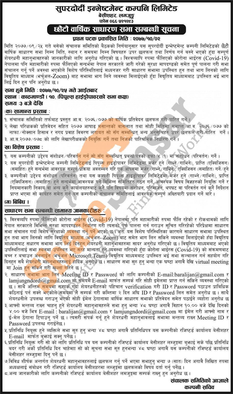 Super Dordi Investment Company Limited has announced its 6th AGM going to be held on Magh 25, 2077.