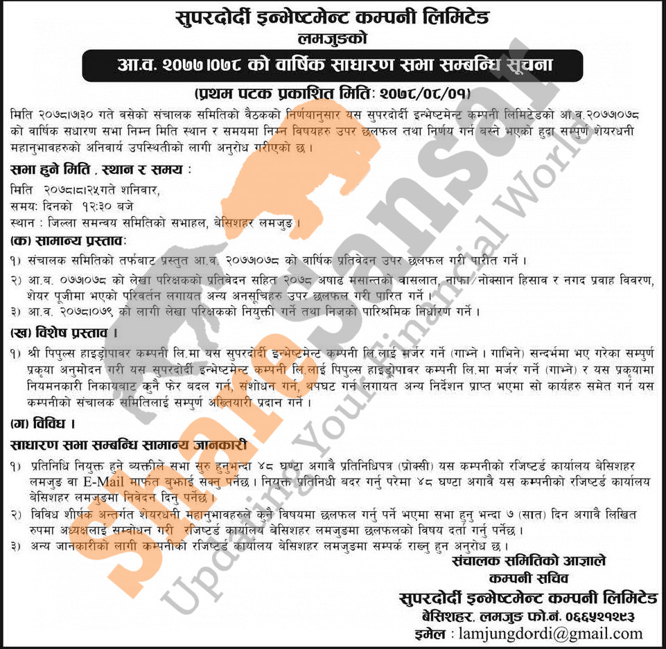 Super Dordi Investment Company Limited has announced its AGM going to be held on 25th Mangsir, 2078.