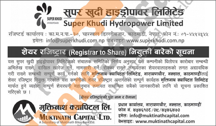 Super Khudi Hydropower Limited has appointed Muktinath Capital Limited as its share registrar.