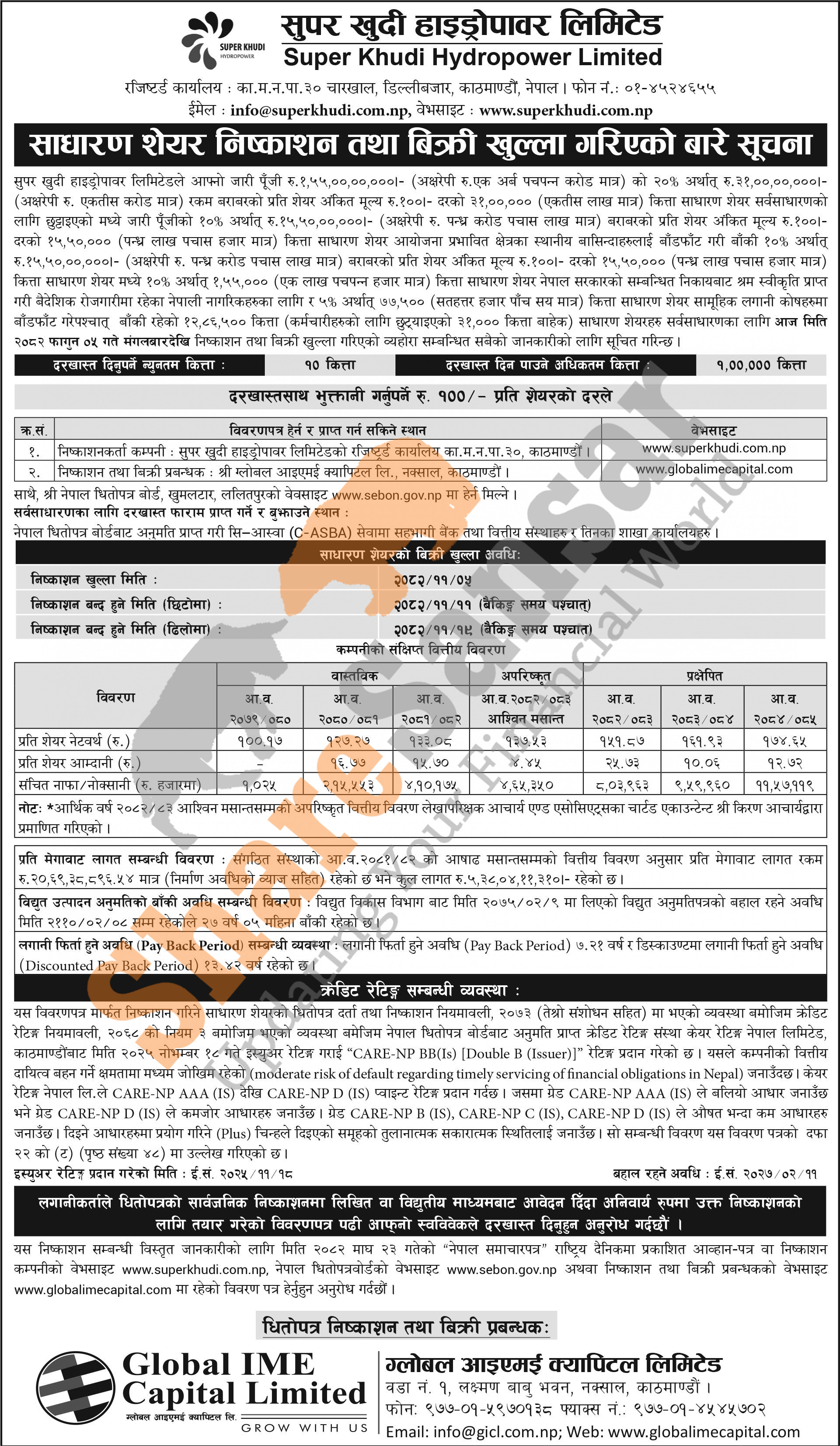 Super Khudi Hydropower Limited is opening its 12,86,500 units IPO shares to the general public from today (5th Falgun, 2082).