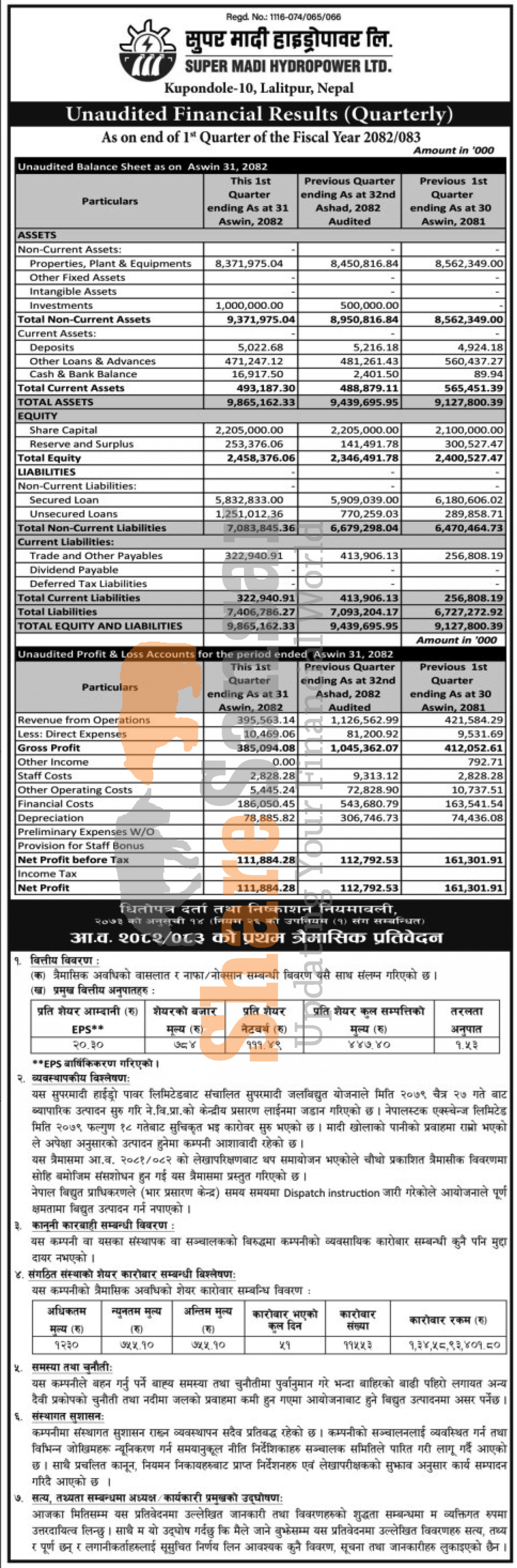 Super Madi Hydropower Limited has posted a net profit of Rs 111.88 million and published its 1st quarter company analysis of the fiscal year 2082/83.