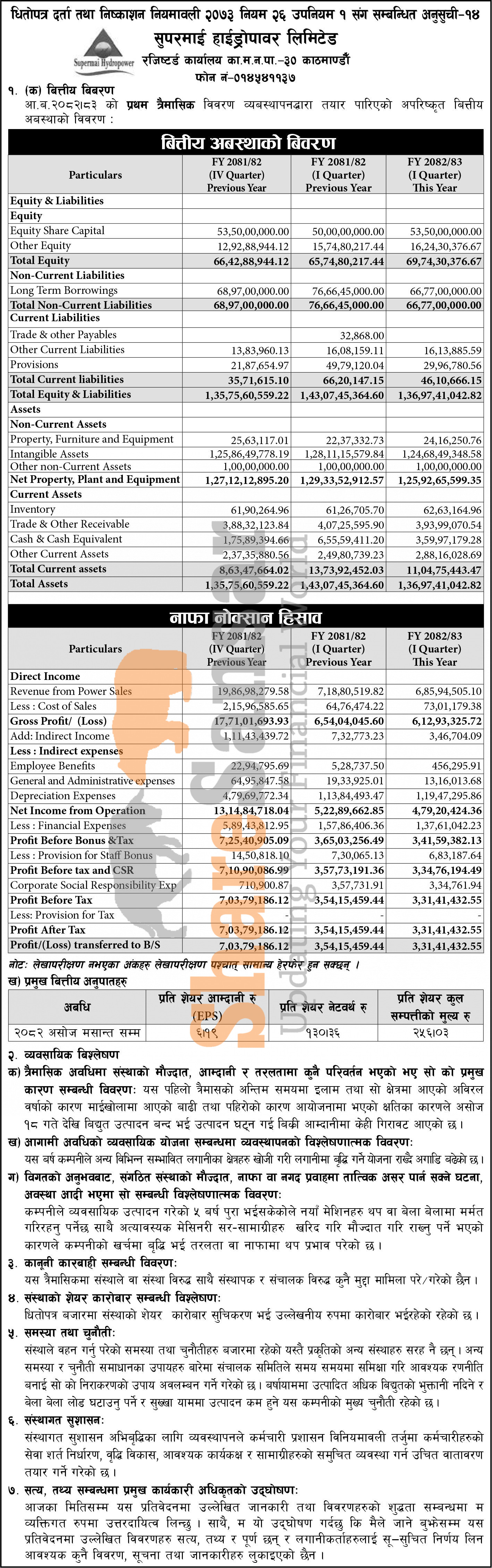 Supermai Hydropower Limited has posted a net profit of Rs 70.37 million and published its 1st quarter company analysis of the fiscal year 2082/83.