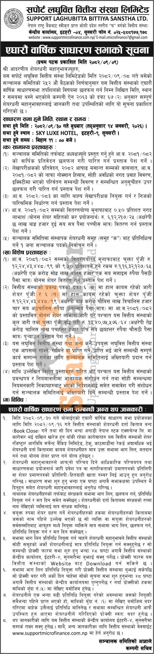 Support Laghubitta Bittiya Sanstha Limited has announced its 11th AGM going to be held on 30th Poush, 2082.