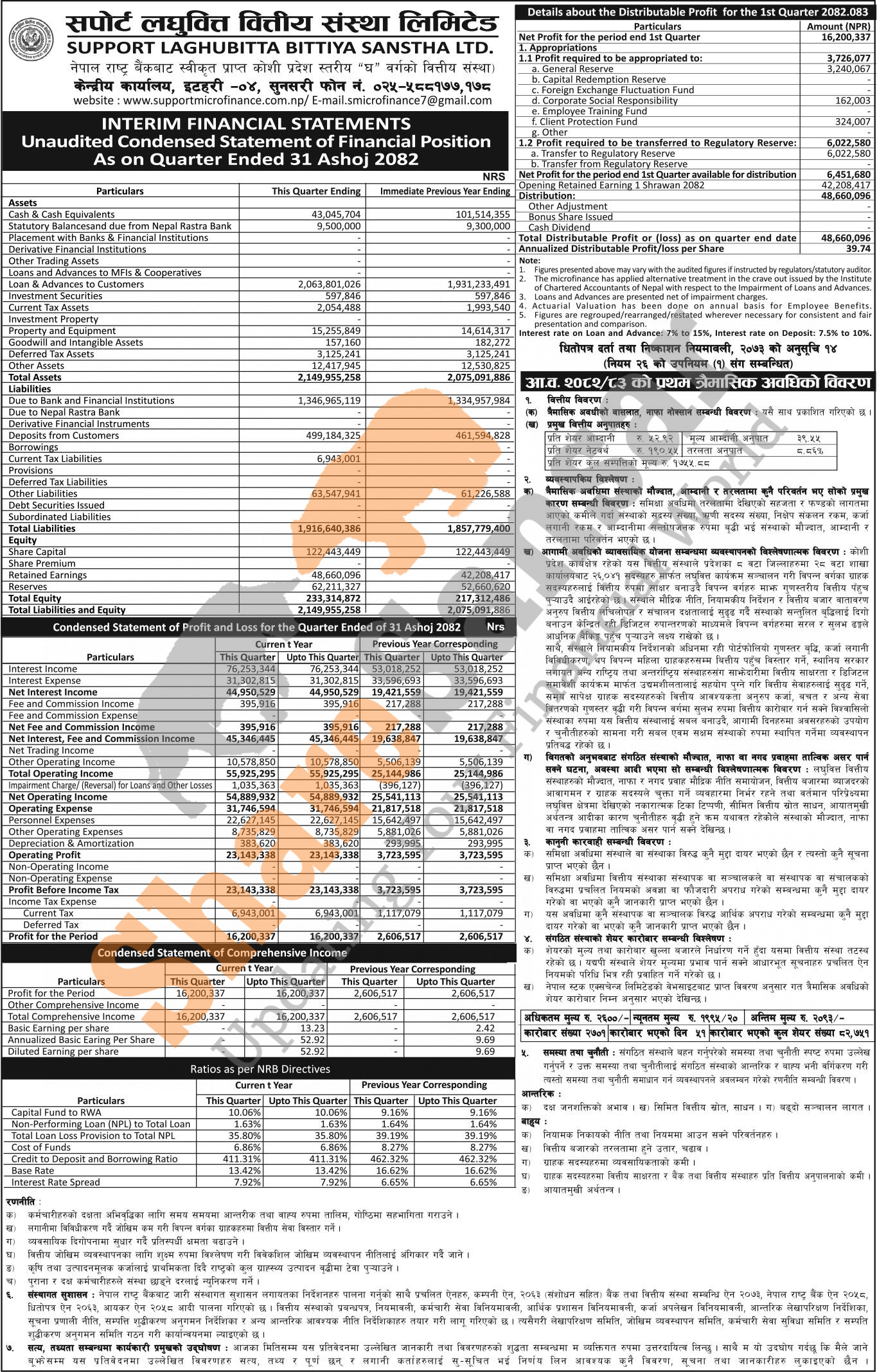 Support Laghubitta Bittiya Sanstha Limited has posted a net profit of Rs 16.20 million and published its 1st quarter company analysis of the fiscal year 2082/83.